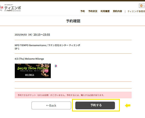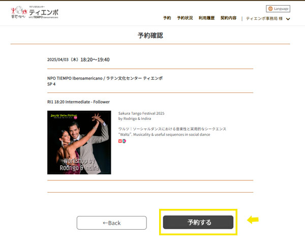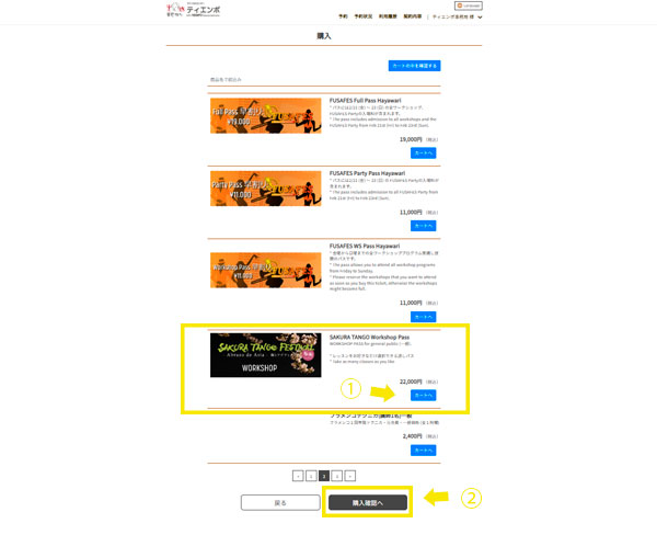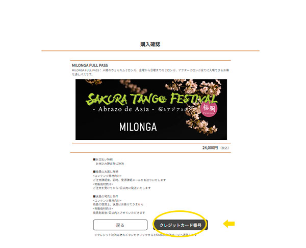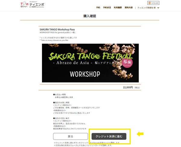 ミロンガ、ワークショップ共に受講管理システムに登録いただき、マイページからクレジット決済でご購入いただきます。